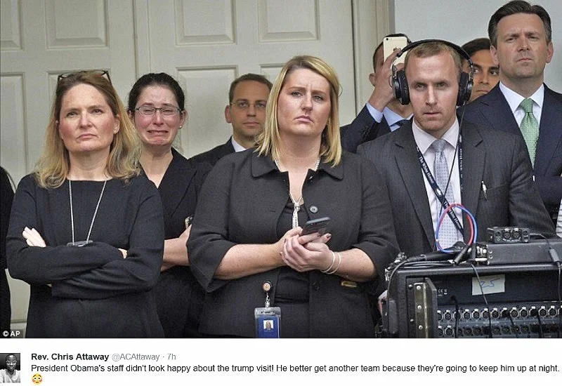 November 12, 2016: A triumphant Trump stops by 1600 Pennsylvania Ave. to check out his new digs. Staff exits outdoors.