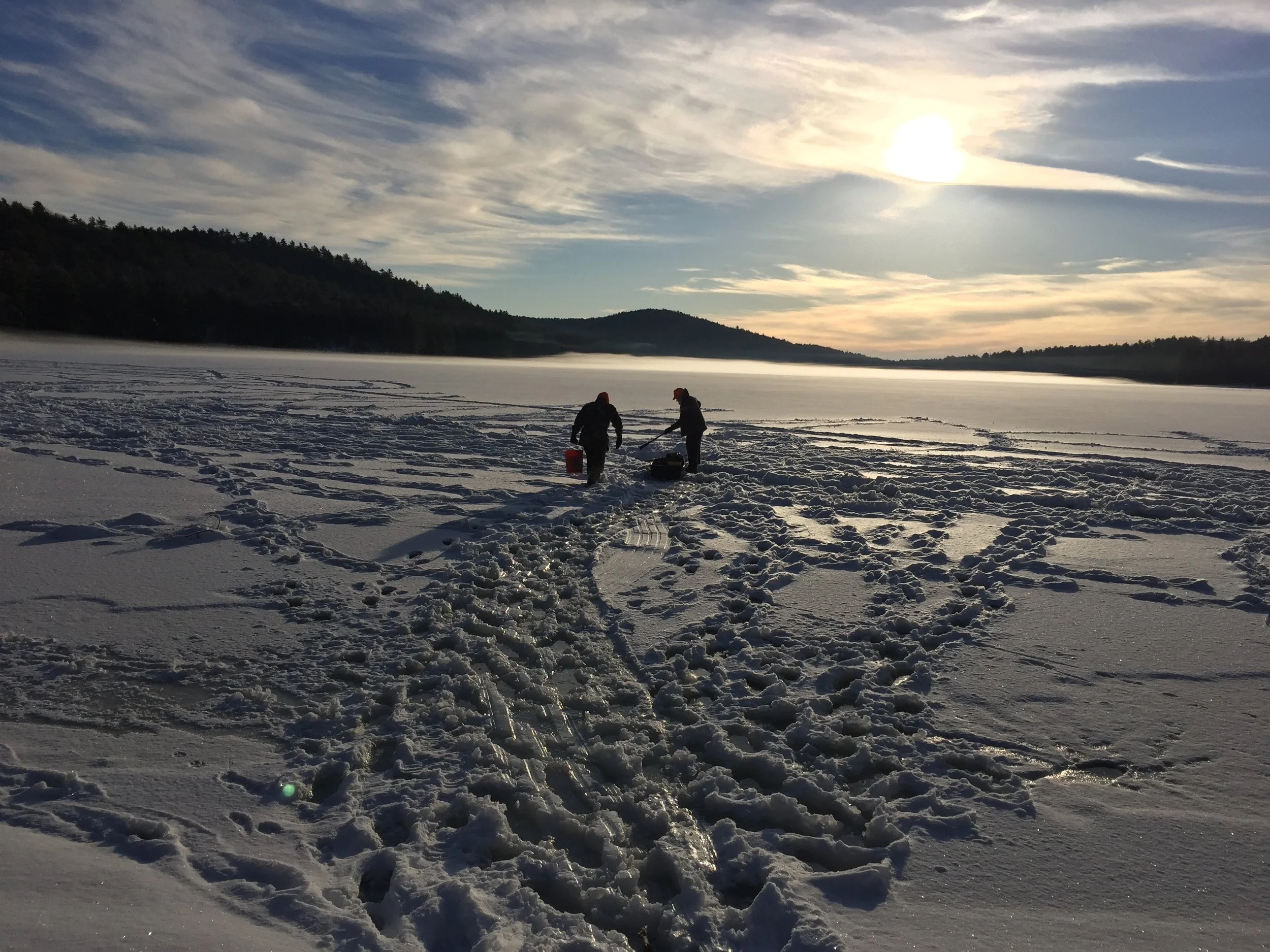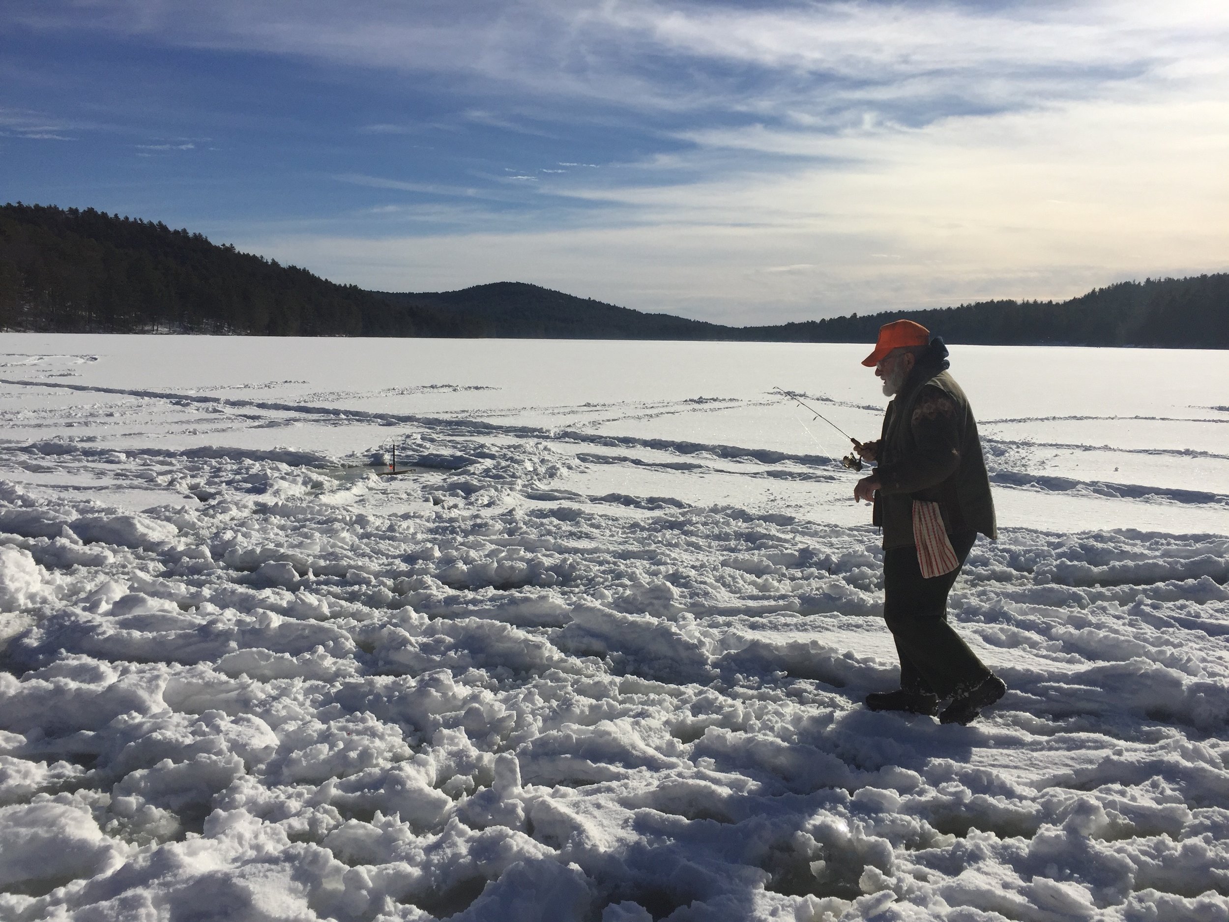 /12 degrees on Long Pond at 8:00, but warmed up to 36 by 11:00 - mut be that global warming thing that so alarmed Leonardo DiCaprio. Fishing with two old coots, "John" and "Bernard" who've befriended me. We each caught our limit of two fish - brookies, 12-14" long, had coffee, visited with one of their friends of about the same age who's still bit laid up after falling and injuring himself pursuing deer, alone, aged 82.