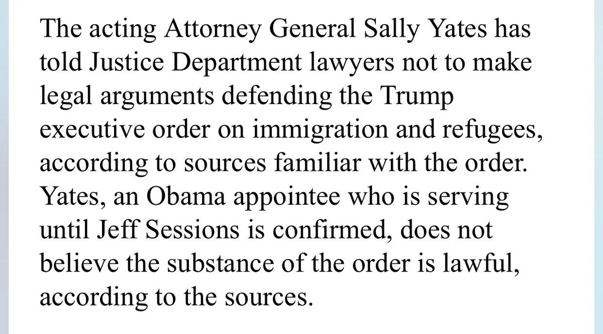 Lawyers take an oath to uphold the law, and if Yates feels that she cannot defend Trump without violating her oath then she is right to refuse to do so, and resign, just as Elliot Richardson and William Rukelshaus did during the Saturday Night Massacre back in Watergate days.