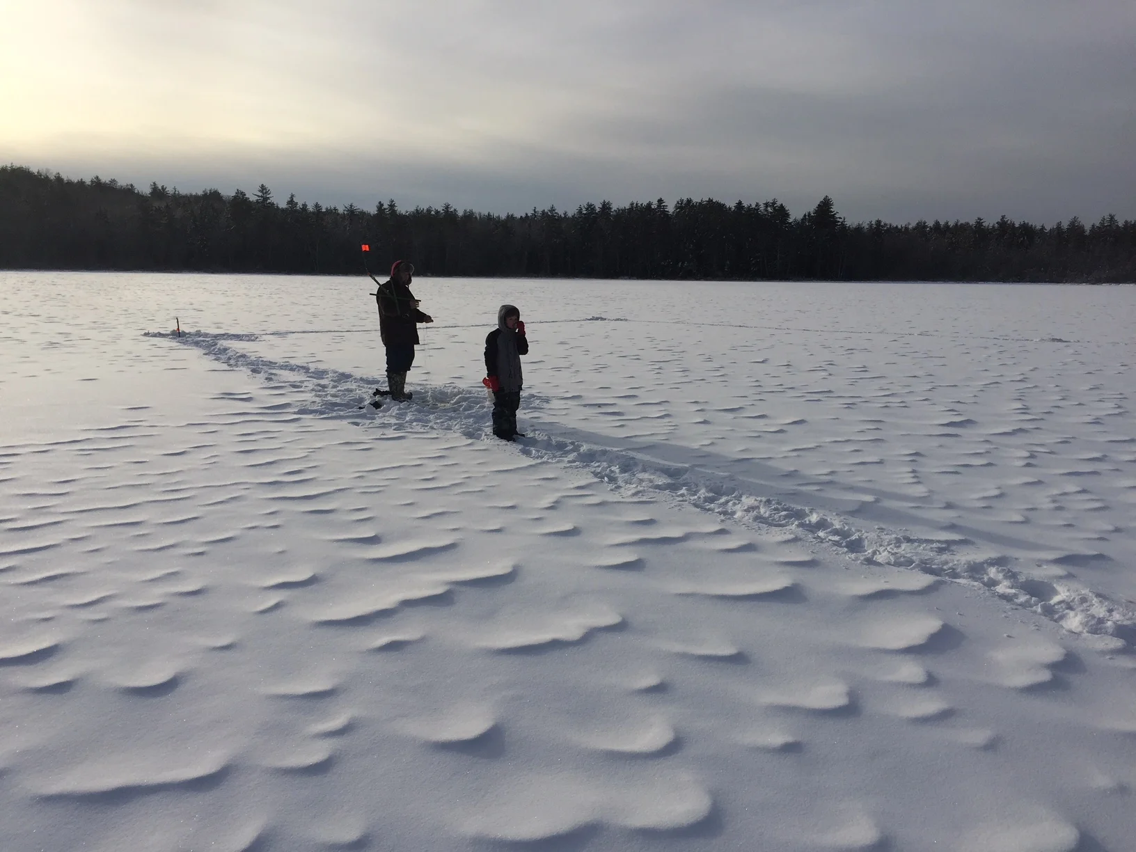 /Setting tip-ups on Billy's Pond, Norway, Maine (that's Christopher Hill, 6-years-old, in foreground. They grow 'em sturdy up here)