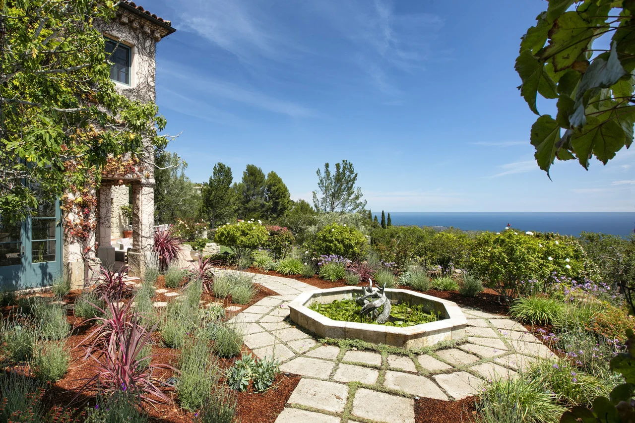 Perched in the Montecito foothills, the property overlooks the Pacific Ocean and surrounding mountains. A long drive over a stream and past mature olive trees leads to the front of the 9,500-square-foot main house, according to the listing with Suzanne Perkins of Sotheby’s International Realty.