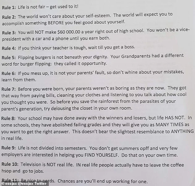 The demeaning guidelines included 'advice' on how to cope with life after high school, with one rule claiming you should 'accomplish something before you feel good about yourself', and another warning employees that 'life is not fair - get used to it'.