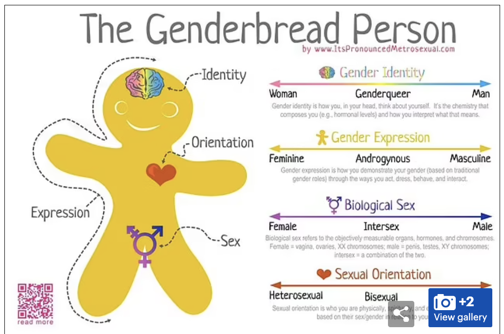 Force staff who are confused by any of the definitions are directed to the ‘gender bread person’ diagram, which includes a series of sliding scales that relate to gender identity, sexual orientation, gender expression and biological sex.
