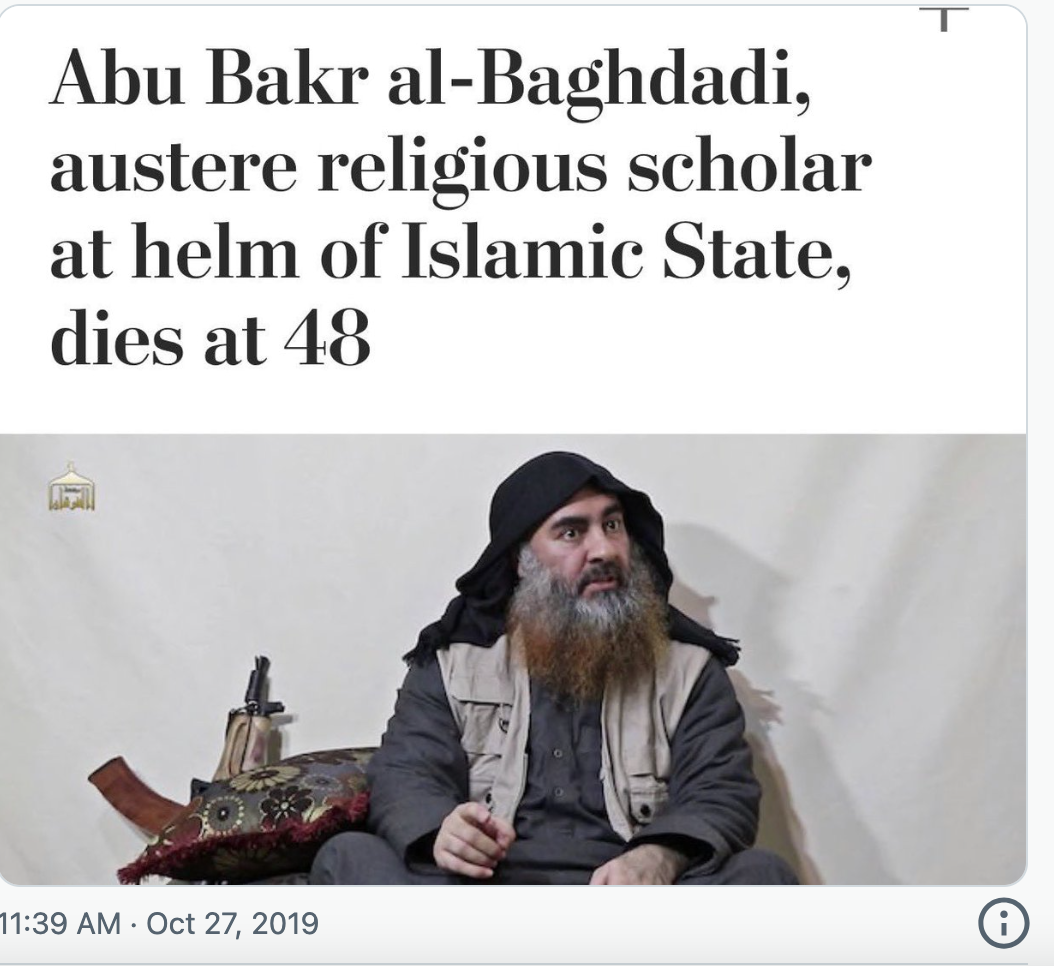 Perhaps the Times should ask its readers for alternative headlines to describe the death of the Elvis impersonator who was promising to “kill you all”, as the Washington Post did in 2019 after the U.S. caught up with Abu Bakr al-Baghdadi, notorious terrorist and head of IS, and sent him packing to meet his awaiting virgins. The WaPo’s editors’ own attempt at a headline, “austere religious scholar dies at 48” was applauded by conservatives, who contributed proposed headlines for other public figures: