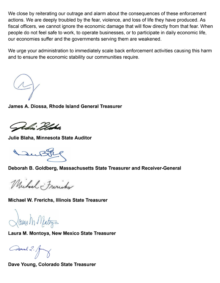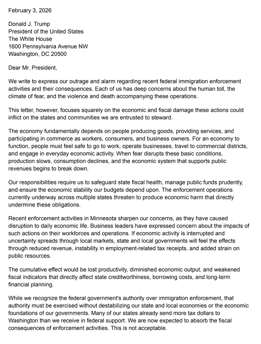 “We are now expected to absorb the fiscal consequences of [federal] enforcement activities,” the treasurers of 16 states wrote to President Trump. “This is not acceptable.”
