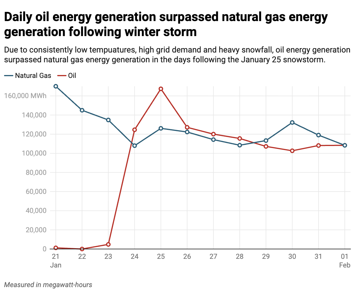 During that time, the region relied heavily on oil to produce electricity — a phenomenon that is not unusual for the occasional New England cold snap. But data shows that oil reliance lasted far longer than normal.