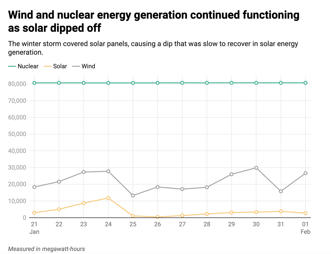 Not all renewable and clean-energy sources suffered as much as solar during the storm and subsequent cold weather. Nuclear performed at a near-constant output, meeting about one-quarter of the region’s demand.