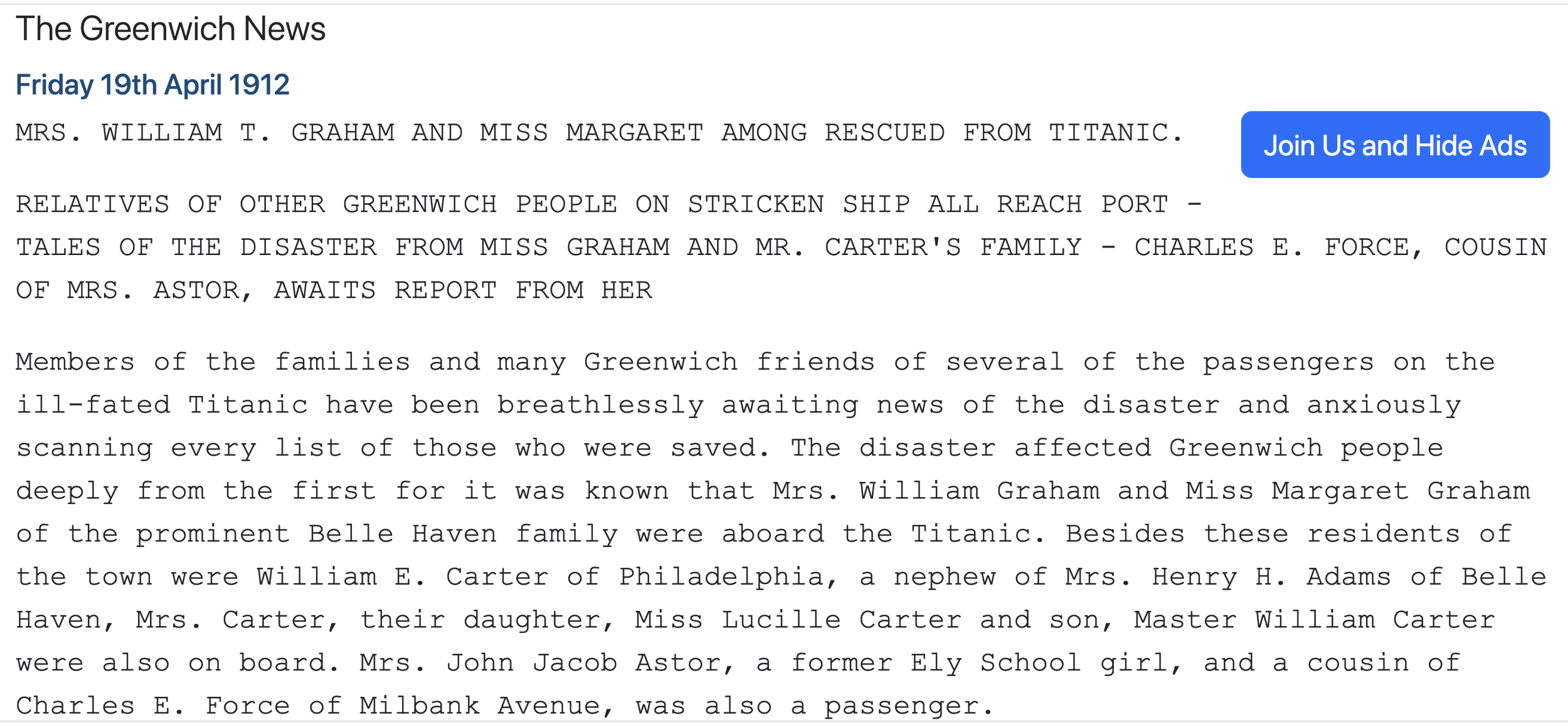/While looking up something about the loss of the Titanic I came across this article from 1912. It’s not in a format that allows copying text, so I took two snapshots to give you a taste. The article itself is quite short — accessible to even readers with short attention spans (well, perhaps not the Irish descendants of steerage passengers), so the link’s there if you want it.