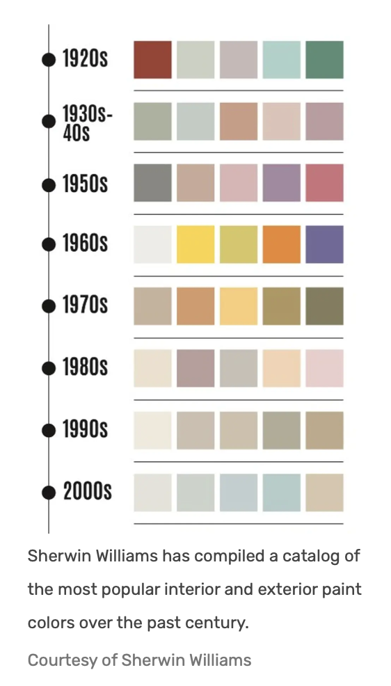 Consumers do seem to have a taste for gray and muted colors. Sherwin Williams, the paint manufacturer, has tracked color trends over the past century. Bright hues dominated the earlier part of the 20th century. In the 1970s, brown and beige were big. A pronounced shift toward gray began in the 2010s. In the current decade, five of the top 10 exterior house colors are shades of gray, according to the paint company’s marketing department.