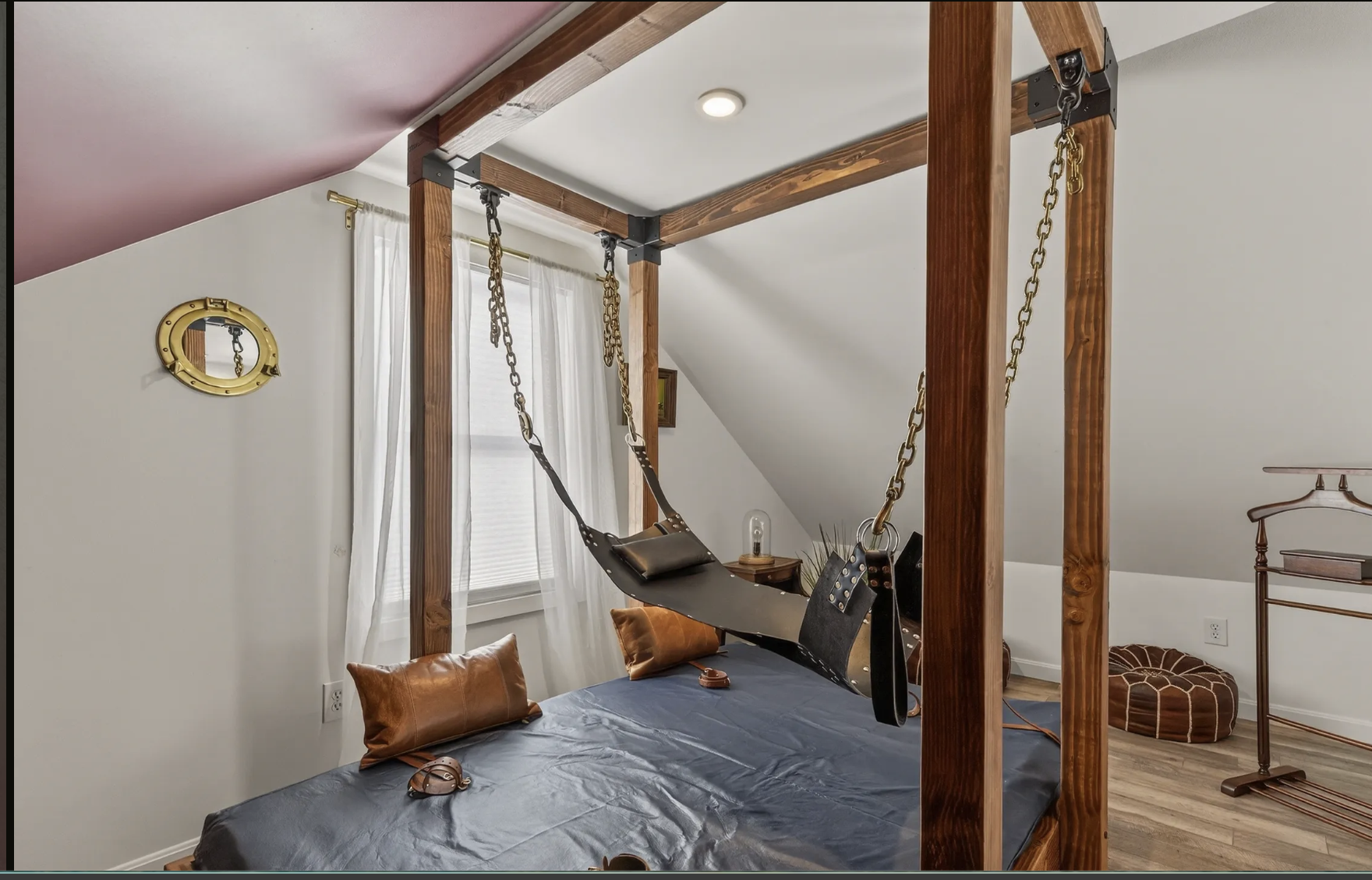 Designed for two people, the home offers a standard kitchen, living space, one bedroom and one bathroom. The property’s other bedrooms, however, have been remodeled to be themed “play rooms” with restraints and specialized furniture that are designed for couples to be intimate.