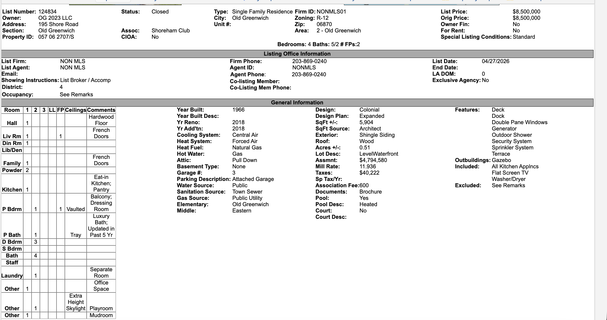 /195 Shore Road has sold for $8.5 million. Non-MLS this time around, but two agents and two brokerage offices, Daphne Lamsvelt-Pol and Jennifer Leahy Sotheby’s and Compass, respectively, negotiated the deal, so it was an arms-length transaction; that’s always wise, in my opinion, for both buyer and seller.