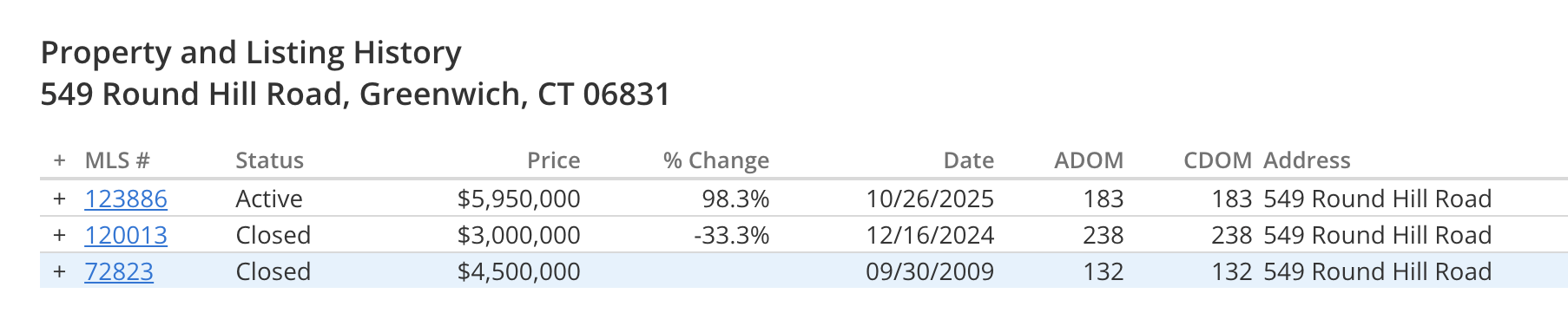 /549 Round Hill Road has cut its price from $6.950 million to $5.950. Impressive, but it sold for $3 million in 2024, and other than having a computer draw up some architectural plans that a buyer probably won’t want, and tearing down the 1775 house that stood on the property, not much appears to have been done here in the past year-and-a- half.