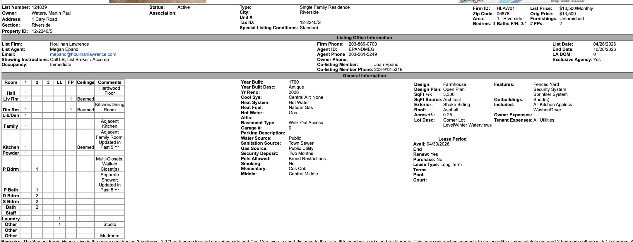 The Samuel Ferris House: Live in the newly constructed 3 bedroom, 2 1/2 bath home located near Riverside and Cos Cob town, a short distance to the train, I95, beaches, parks and restaurants. This new construction connects to an incredible, immaculately restored 2 bedroom cottage with 1 bathroom. Approximately 2100 Sq. ft of new space also includes additional storage space in the basement not included in this figure. Great flat yard and distant water views of the Mianus River. The guest cottage, which has been restored to near original condition, can be used as an office/ in law or guest suite with 1200 sq. ft distinguished as the oldest house in Riverside and one of the few remaining 18th century buildings on Putnam Avenue. The Samuel Ferris House (circa 1760) sits proudly with its storied history. Beamed ceilings, original wide floorboards and other charming Colonial features combine with the modernity of central AC and all new electrics and plumbing.