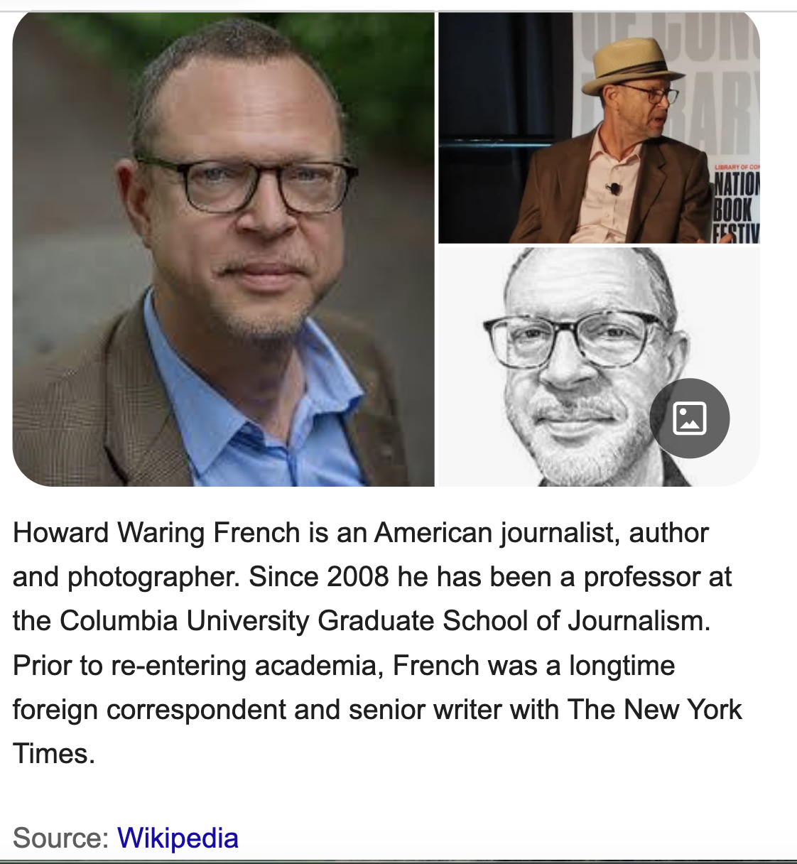 Bonus material, because after posting this initially, I went looking for information on Howard French, mentioned above, just to refresh my memory. As it turns out, my distant memory of him was spot-on: Columbia School of Journalism; NY Times foreign correspondent, and an expert on how it was Africa that was at the center of the rise of the Western world. What would we do without experts?